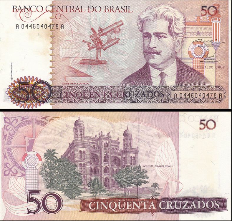 Brazil 50 Cruzados, 1986, P-210a, UNC, DR Oswaldo Cruz y el instituo en su nombre, epidemiologo
